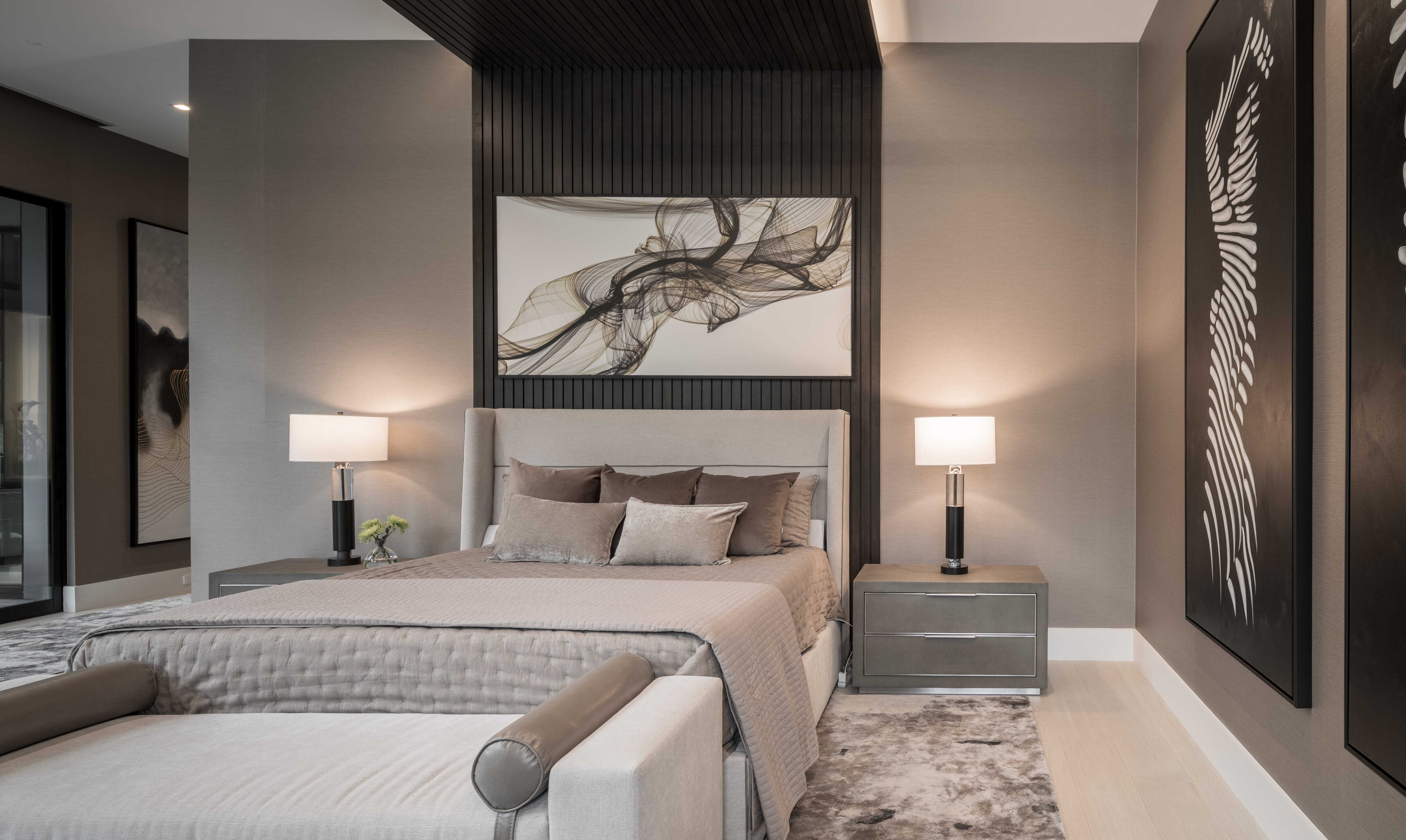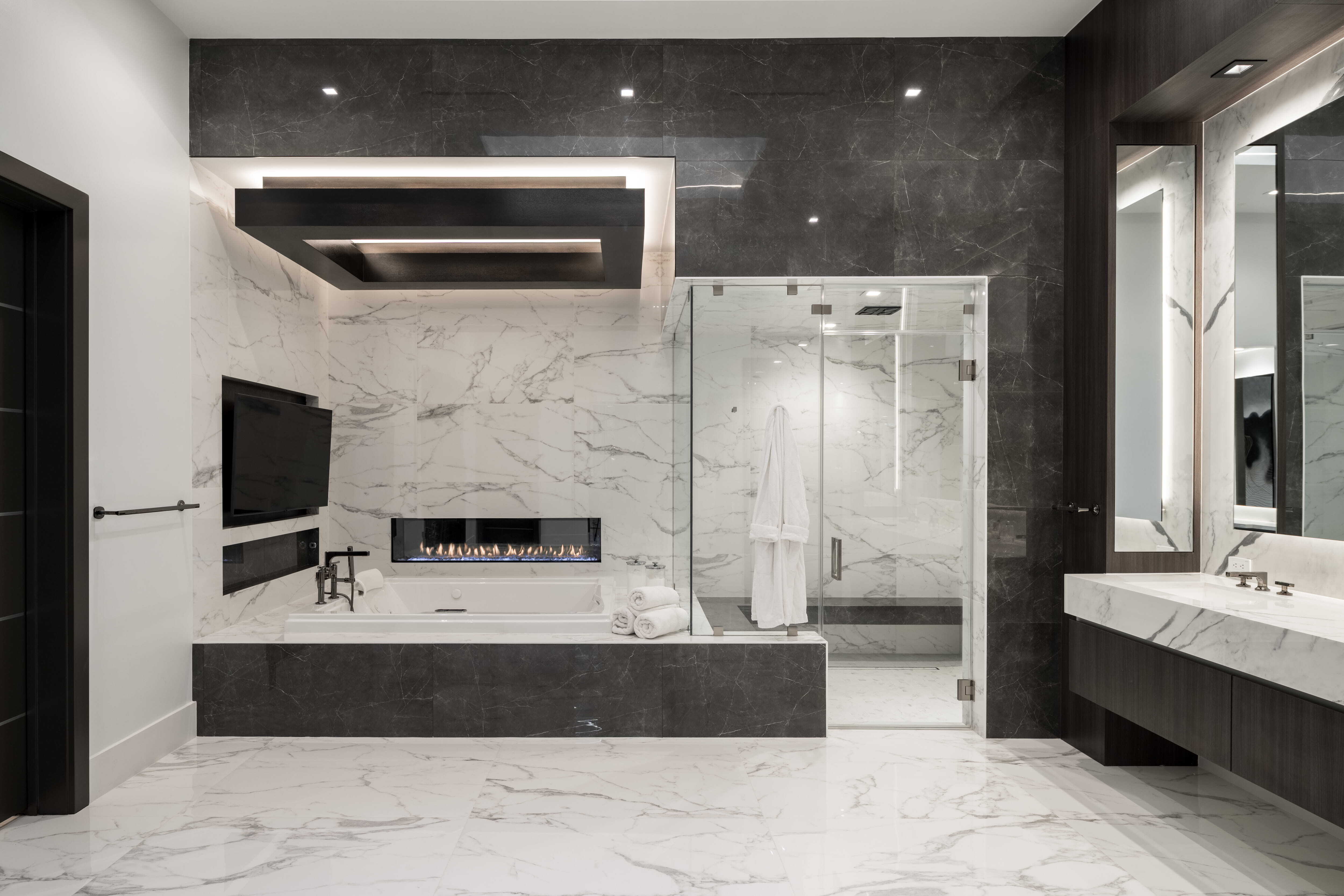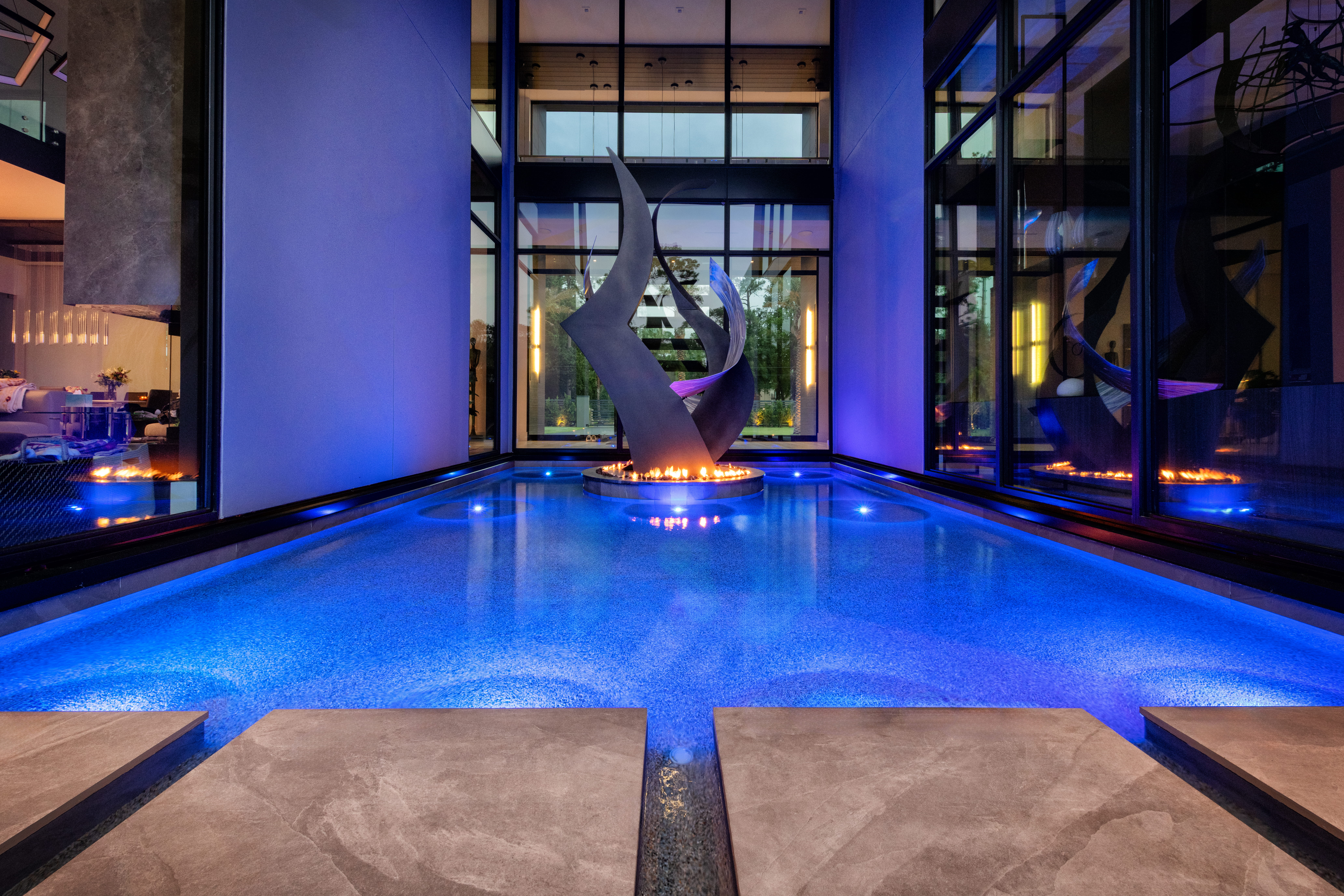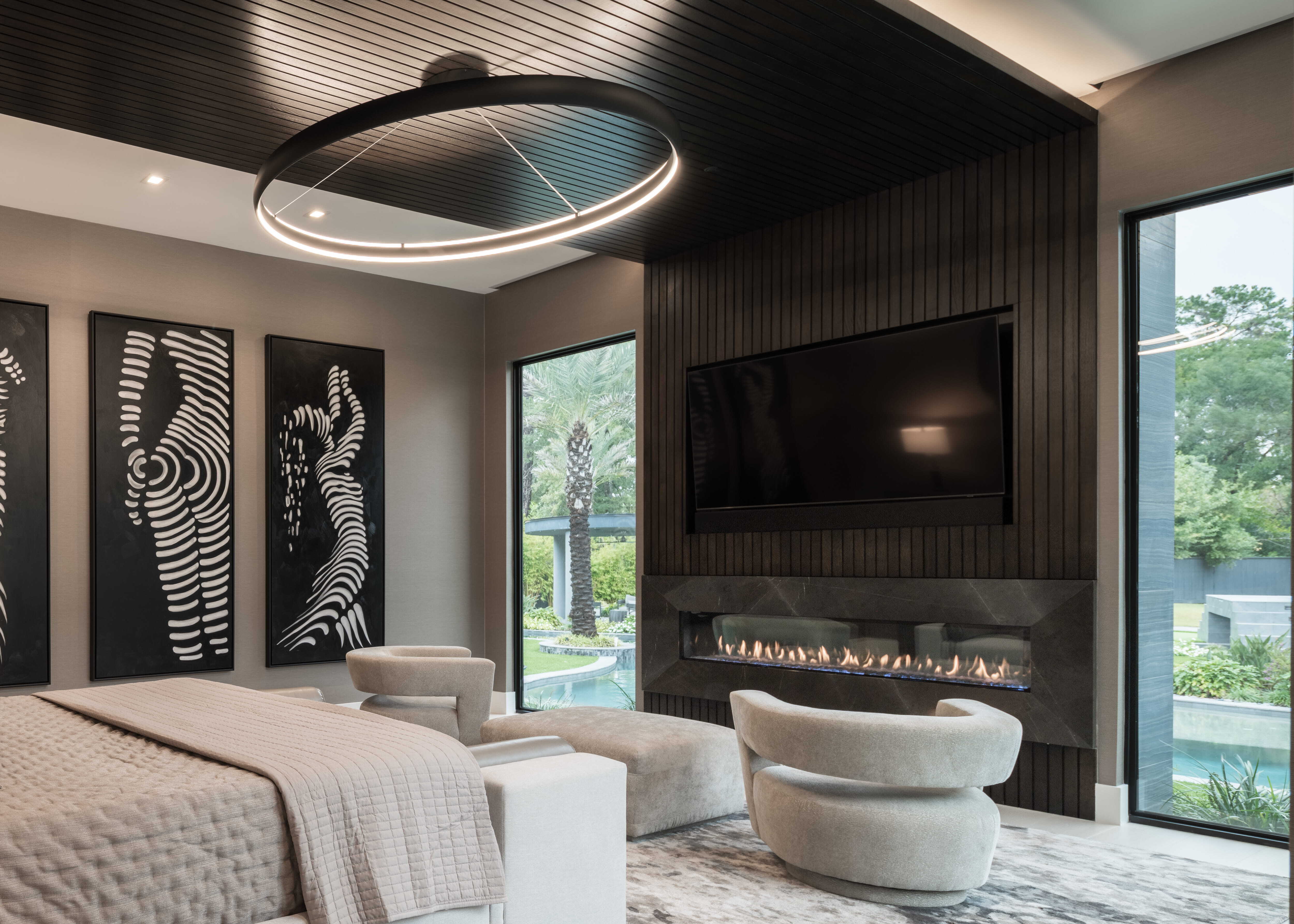 The design direction of the home was clear from the first step of the process: modern, clean, and dramatic. This cohesive aesthetic is reflected throughout the home, from the exterior elevations to the interior architectural detailing to the finishes and furnishings. Pops of excitement and color show up in various spaces throughout the home, especially in the Candy Bar, Theater, Game Room, and the kids’ bedrooms.
